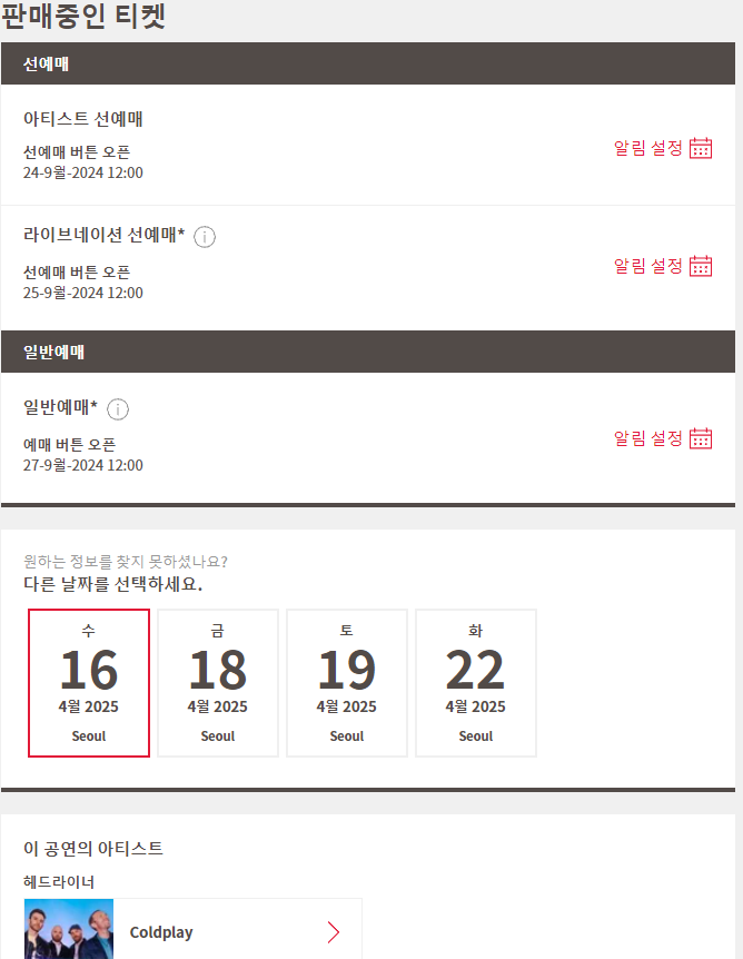 1. 아티스트 선예매 홈페이지에 들어갑니다. (예: 콜드플레이 내한공연 선예매 홈페이지)